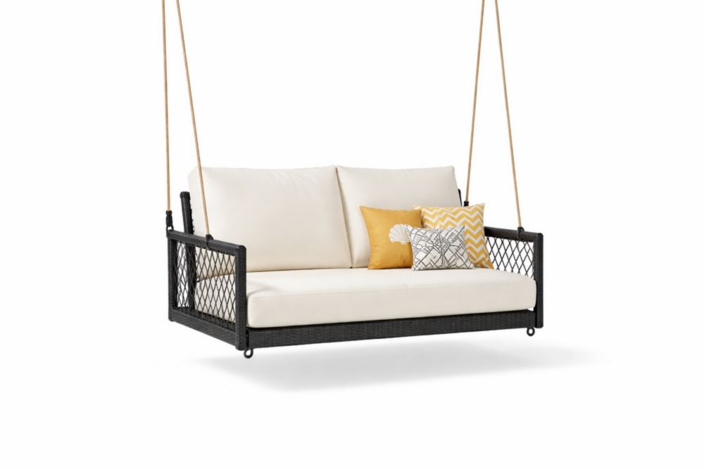 Balancelle suspendue extérieure en osier noir, coussins crème