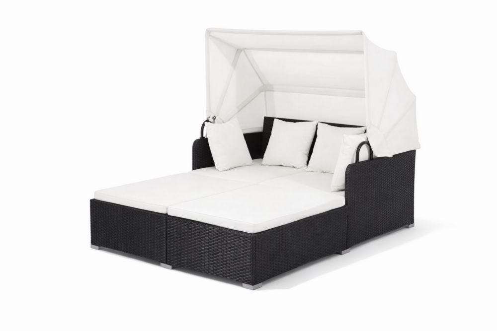 Lit de Jardin Double en Résine Tressée Noir et Blanc avec Canopy