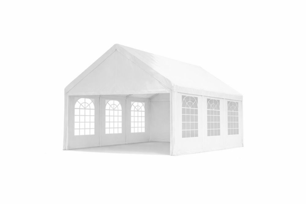Cette tente de réception est fabriquée en PVC résistant et dispose d'une structure en acier galvanisé assurant sa solidité.
